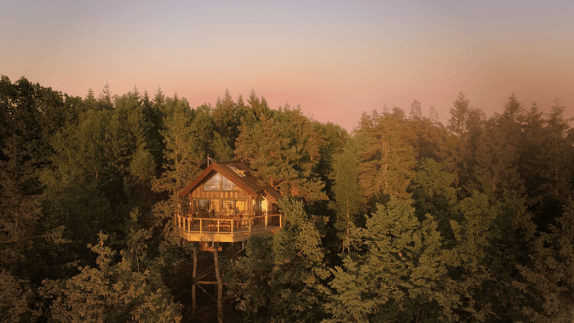 Visit Laagen also has a treehouse, two forest cabins, and more glass containers. Fireplace inside. Terrace outside. Take your pick.