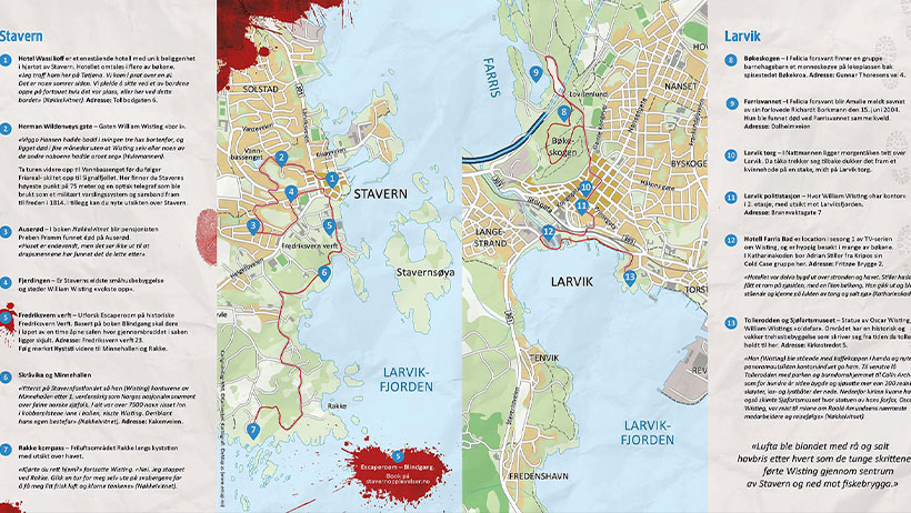 På tur i Stavern og Larvik er det lett å kjenne igjen stedene fra bøkene og serien. Vi har laget et eget Wisting kart som gir oversikt over lokasjoner og klare referanser til hendelser i bøker. Her kan publikum på individuell basis oppsøke de ulike lokasjonene i eget tempo, og i fritt valg av tid og sted.